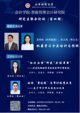 2022年11月10日晚7点-10点,由必威西汉姆联必威西汉姆联与智能管理会计研究院联合举办的研究生论坛(暨博硕士生学术沙龙活动)第四期以线上会议的形式举行。参会人数达210余人。