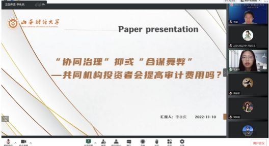 在工作论文研讨环节,李永庆硕士首先汇报了工作论文《“协同治理”抑或“合谋舞弊”——共同机构投资者会提高审计费用吗?》。三位点评老师分别给出中肯的修改建议。袁春生老师指出:共同持股的衡量方式是否合理有待考虑;文章研究内容丰富,但论文逻辑链条较长,需进一步缕清思路。郭檬楠老师指出:文章可以根据审计费用的经典模型,探讨共同机构投资者对审计收费的独特影响机制,以更好地提高研究价值;可以结合研究结论,进一步丰富政策启示。刘钟敏老师指出:文章存在内生性问题,建议利用工具变量法;企业性质分组部分前后逻辑混乱,需进一步完善。王晓亮老师作为指导教师介绍了文章的选题背景,并要求学生根据大家提出的修改意见进一步修改完善。