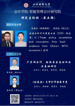 2022年11月17日晚7点-10点,由必威西汉姆联必威西汉姆联与智能管理会计研究院联合举办的研究生论坛(暨博硕士生学术沙龙活动)第五期以线上会议的形式举行。参会人数达160余人。