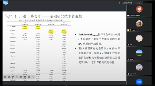 工作论文分享环节,常雨茹硕士分享工作论文《产学研合作、创新要素流动和企业基础研究》。吴秋生老师指出:文章的选题角度比较新颖,内容的完整性和规范性较强;但企业是应用研究的主力军,题目的概念需要进一步区分,并建议调节从如何做产学研才能提高研发质量入手。黄贤环老师指出:需要将产学研合作科研成果的归属理清;指出创新要素的内涵需要界定,并针对创新要素作为题目的恰当性提出疑问;建议增加国内外企业基础研究情况的数据比较,突出基础研究的现实意义;另外分别从引言、文献综述、理论分析和实证方面提出进一步建议。李林波老师指出:文章深度不够,可以加入协同效应进一步丰富;另外专有名词需要严格使用且两个中介效用的选取可能存在重合;另外对产学研合作的经济后果建议从企业价值角度进行分析来强化边际意义。郝盼盼老师作为指导老师对大家针对论文提出的修改意见表示感谢。