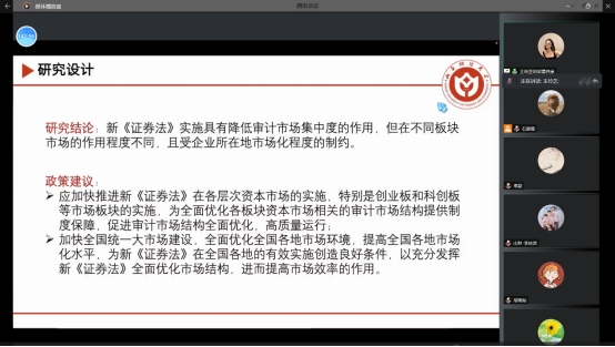 王玲芝硕士分享工作论文《证券法与审计市场集中度》。郝盼盼老师针对文章选取0和1变量分组回归而不是DID模型提出疑问;指出文章的数据到2019年,是否需要更新;并提出新证券法实施是否直接影响当期被解释变量,检验是否需要进行滞后考虑。黄贤环老师指出:用0和1变量衡量新证券法的实施不太严谨,技术问题方面需要重点解决;证券法的目标是提高审计质量,由谁来做是否重要?研究审计市场集中度的意义是否合理;李林波老师指出:注册制是为了提高信息质量,并不是降低审计的市场集中度,目前的逻辑结论多为相反影响,需要进一步考虑;建议进一步考虑证券法在我国实施细则条例的特殊性;林嘉安老师针对文章DID方法的技术处理提出建议。吴秋生老师作为指导教师对四位老师的指导表示感谢。