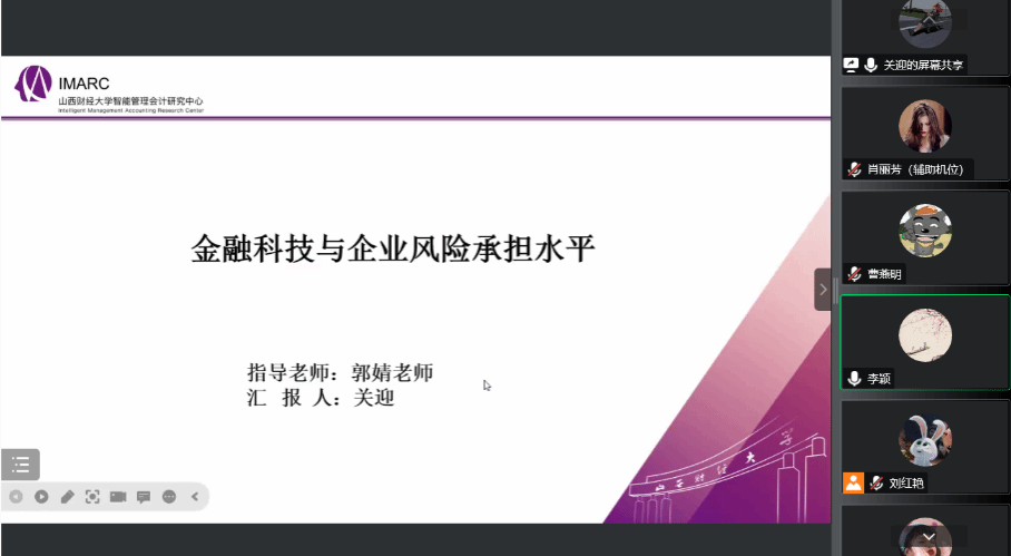 关迎硕士分享论文《金融科技与企业风险承担水平》。田峰老师指出:引言中风险承担水平作用模糊,且需指出研究动机;主假设理论分析与中介机制检验的经营效率和融资约束不符合,分析过程链条过长;回归系数过小,变量影响微弱;异质性分析未做组间系数差异检验。王文慧老师指出:边际贡献有待挖掘;机制逻辑需要进一步梳理,可挖掘金融科技的应用场景,完善机制逻辑;建议引用相关文献,紧扣机制分析,挖掘金融科技如何助力成长期和衰退期企业的风险承担水平以及国有企业风险承担水平。