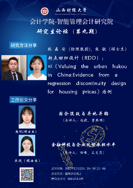 在研究方法分享环节,朱敏硕士分享了文章《Valuing the urban hukou in China: Evidence from a regression discontinuity design for housing prices》的主要内容。林嘉安老师重点讲解了断点回归设计的运用,并耐心解答了刘红艳博士等同学的问题。