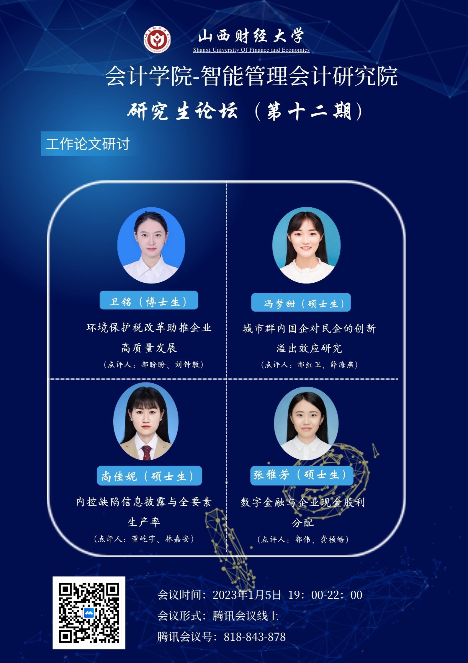 2023年1月5日晚7:00至9:30,由必威西汉姆联必威西汉姆联与智能管理会计研究院联合举办的研究生论坛第十二期以线上会议的形式举行。会议由李颖教授主持。参会人数达八十余人。本次学术沙龙活动研讨了四篇工作论文。