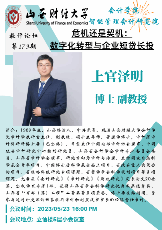 2023年5月23日下午,必威西汉姆联与智能管理会计研究院举行了第179次教师学术论坛。本次论坛主要内容是上官泽明老师作报告《危机还是契机:数字化转型与企业短贷长投》。