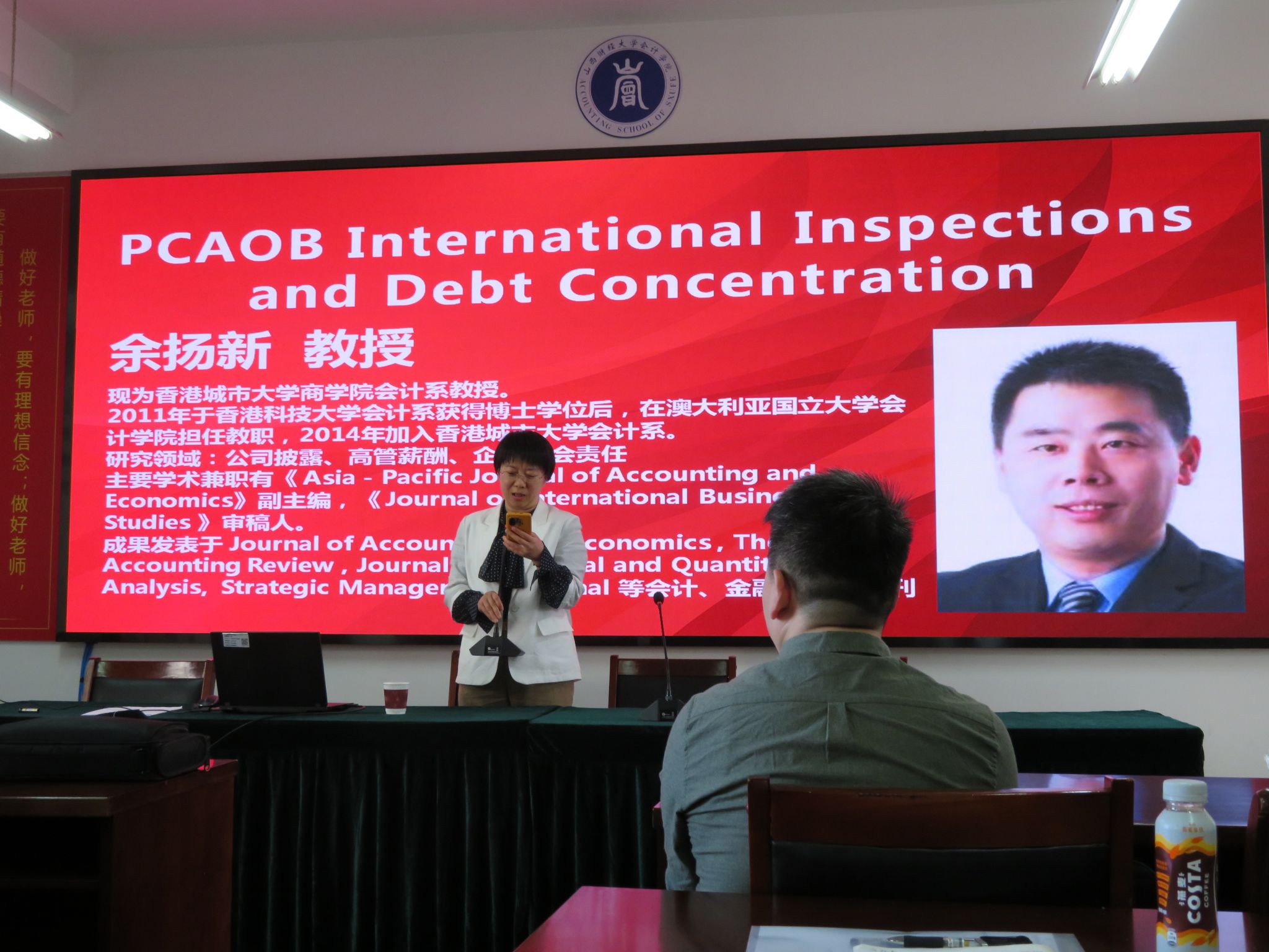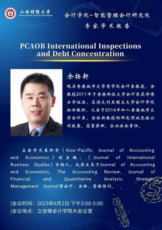 2023年6月2日下午,必威西汉姆联必威西汉姆联与智能管理会计研究院联合举行学术名家论坛,特邀香港城市大学教授余扬新做学术报告《PCAOB International Inspections and Debt Concentration》,学院科研骨干及博硕士生积极参与。