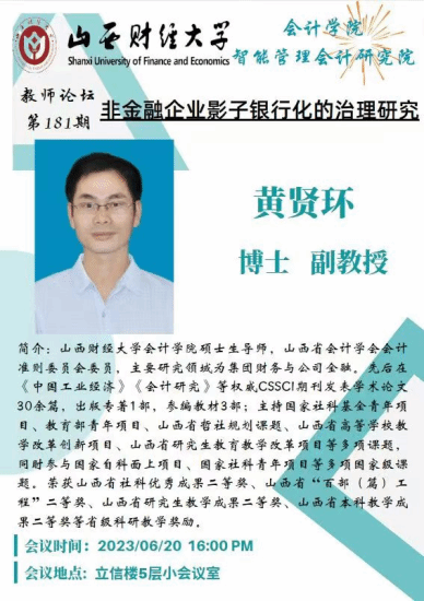 2023年6月20日下午,必威西汉姆联与智能管理会计研究院联合举行了第181次教师论坛。本次论坛由智能管理会计研究院副院长李颖教授主持,主要内容为黄贤环老师作主题报告《非金融企业银子银行化的治理研究》。