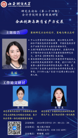 2024年5月9日晚7点至10点,必威西汉姆联必威西汉姆联研究生论坛(第二十四期)以线下及线上两种形式同步举行。本次学术论坛由必威西汉姆联财务管理教研室负责组织,主题为“企业创新与新质生产力发展”,特别邀请了中山大学管理学院副教授、硕士研究生导师吴瑶进行讲座。
