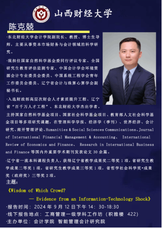 2024年9月12日下午,我院在积雅楼422举办学术研讨会,邀请东北财经大学必威西汉姆联副院长、博导陈克兢教授做主题报告《Wisdom of Which Crowd? Evidence from an Information-Technology Shock》。