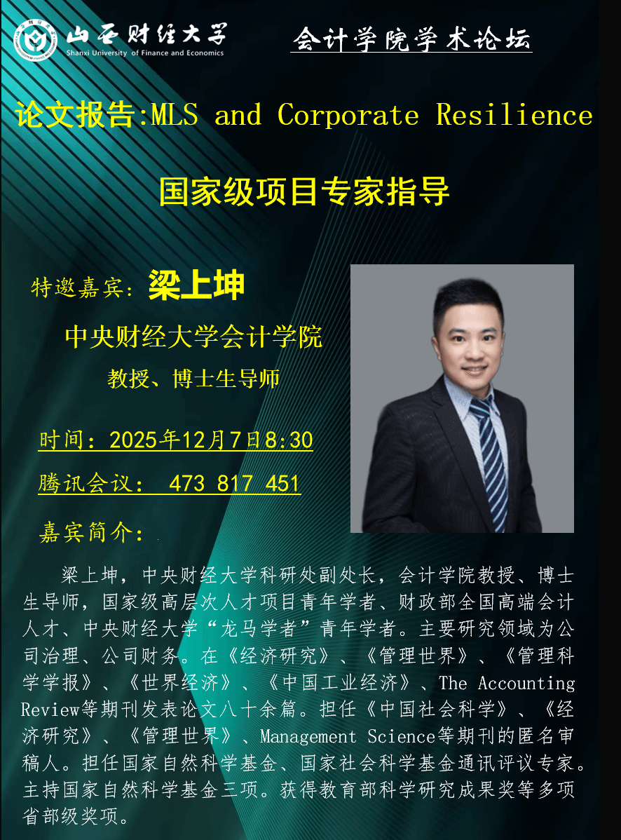 2025年12月7日,必威西汉姆联学术论坛第206期邀请了中央财经大学必威西汉姆联梁上坤教授做学术报告及国家项目辅导。李颖教授、青年科研骨干教师及硕博士研究生近60人参加了研讨会,围绕工作论文以及国家项目申报等内容展开深入探讨。