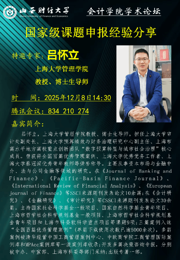 为帮助学院青年科研骨干教师及硕博研究生精准把握国家级课题申报要点,规避申报误区,提升申报质量与成功率,12月8日,我院特别邀请上海大学吕怀立教授担任主讲嘉宾,举办国家级课题申报经验交流分享会。