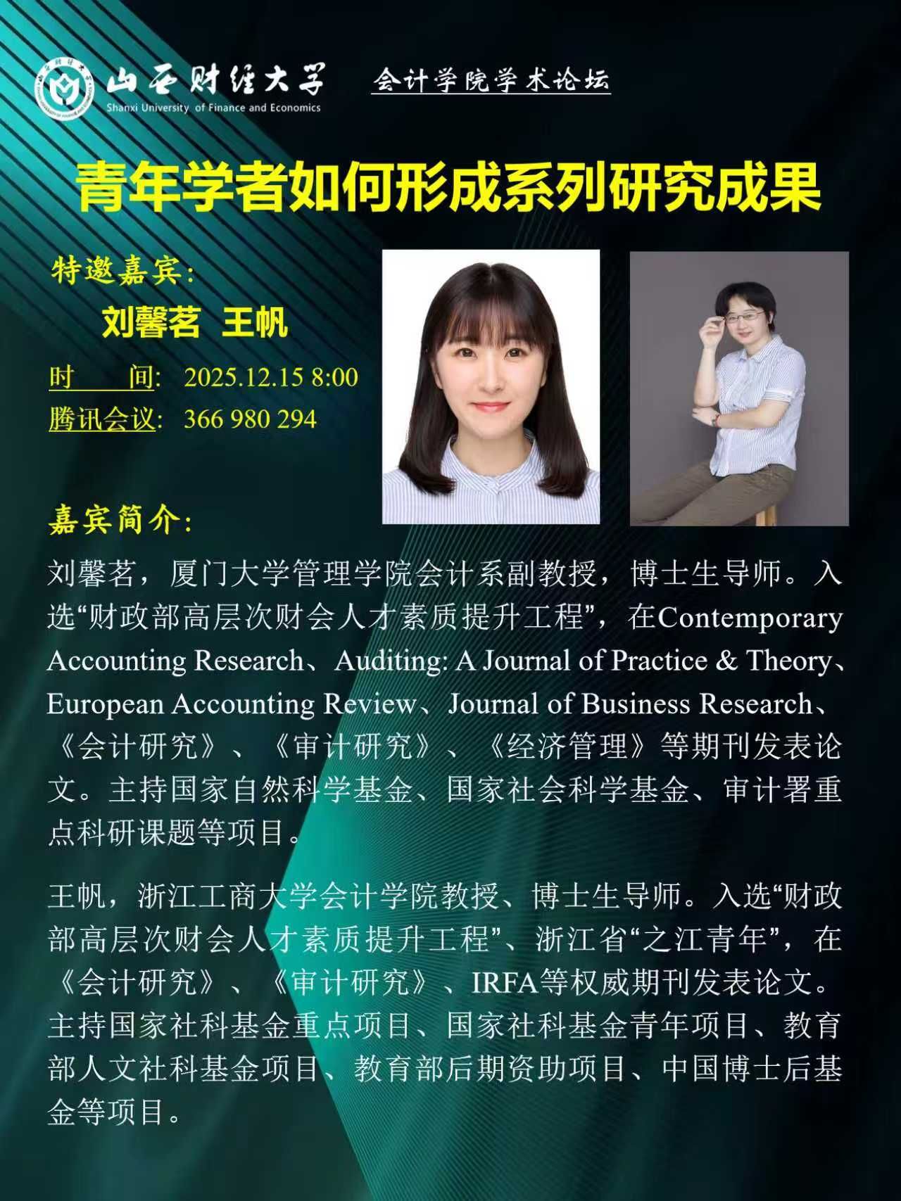 2025年12月15日上午,必威西汉姆联学术论坛第218期如期举行。本次论坛以“青年学者如何形成系列研究成果”为主题,特邀厦门大学管理学院会计系刘馨茗副教授和浙江工商大学必威西汉姆联王帆教授作专题报告。两位嘉宾结合自身科研经历,分享了从选题、方法到成果凝练与发表的全过程思考,为在场师生带来了一场高水平的学术对话。