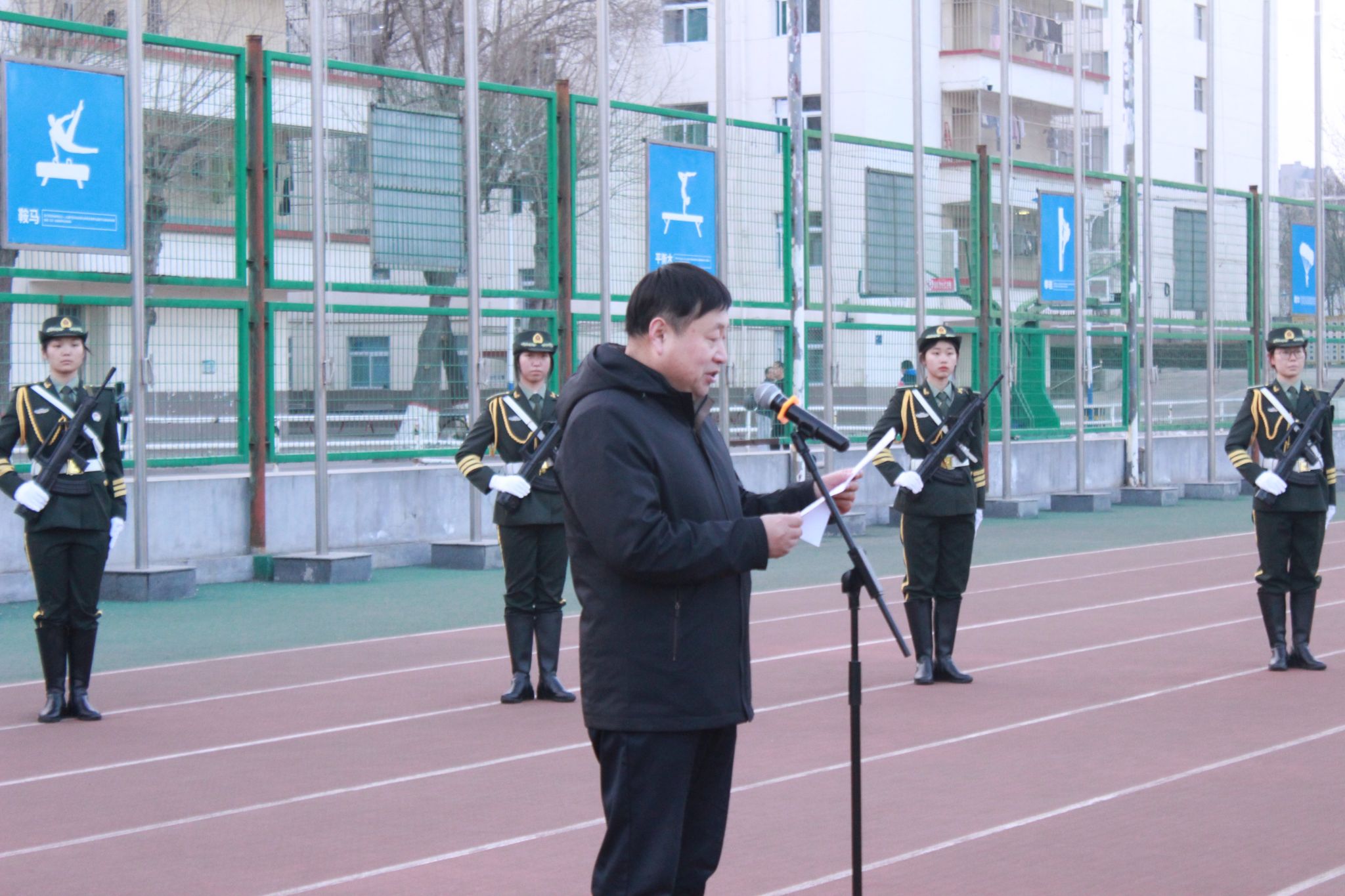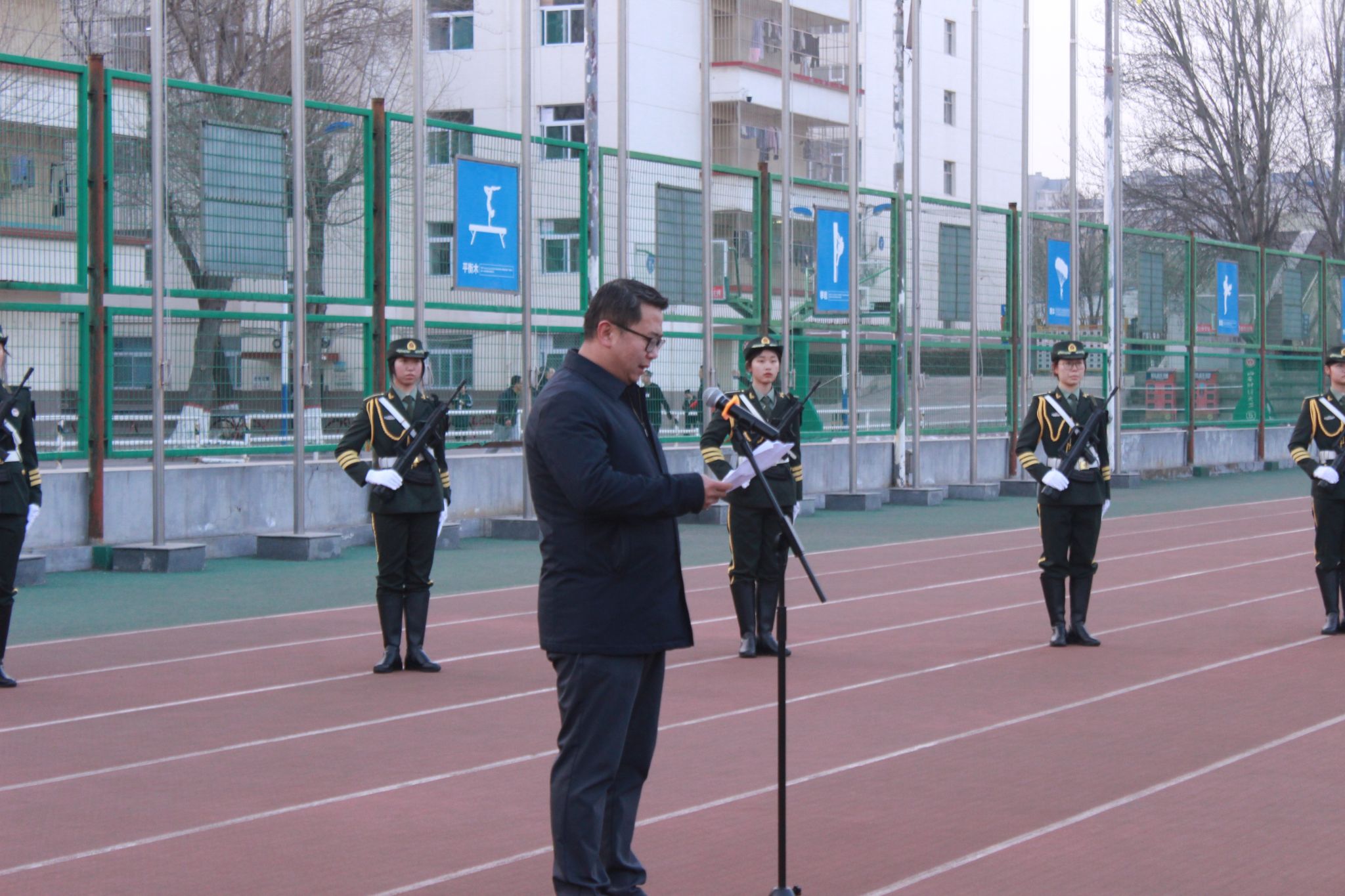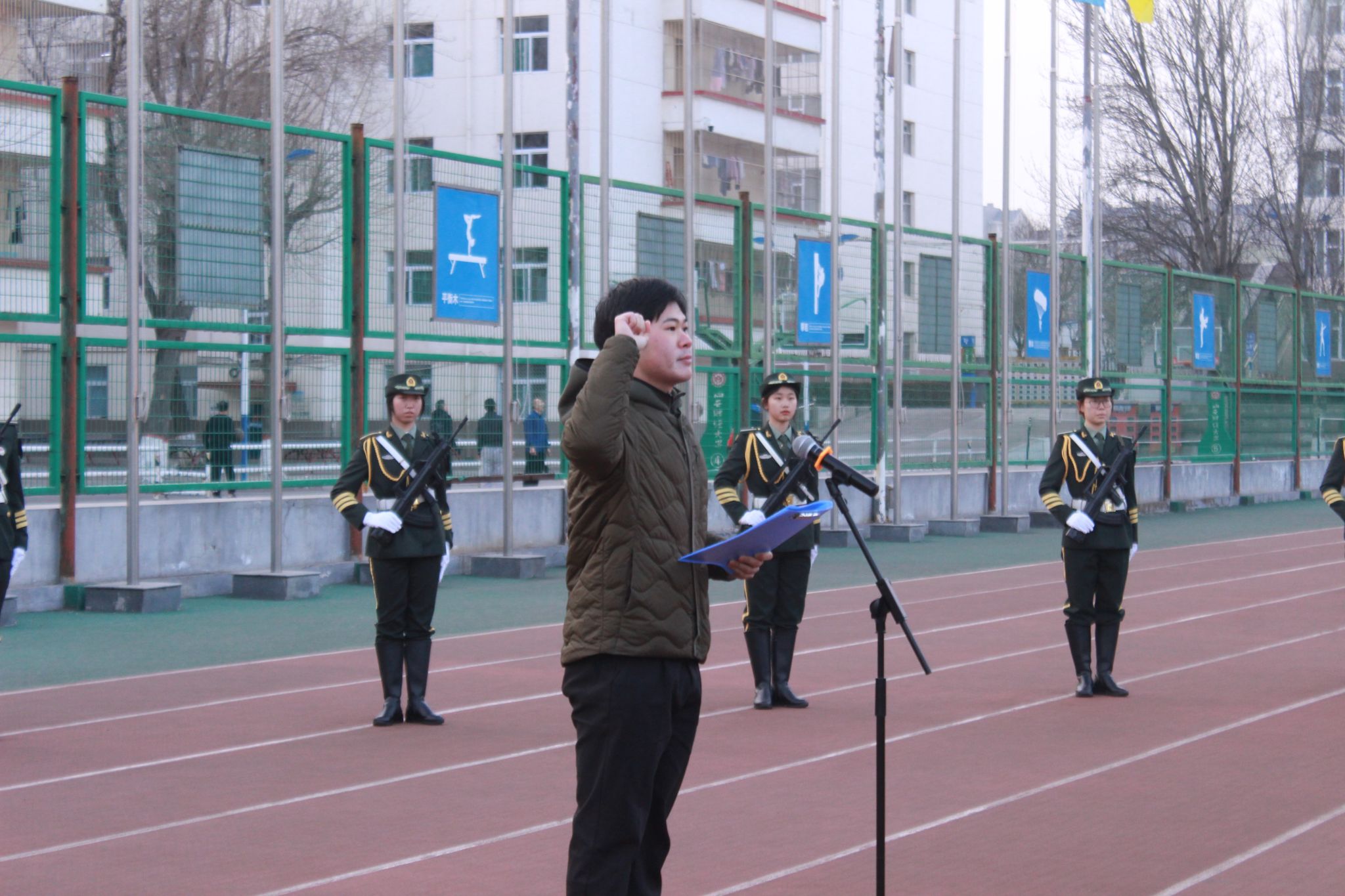 退役复学大学生代表、2021级财务管理1班学生时奕鹏带领全体同学进行学生承诺践诺宣誓:“尊师爱友讲诚信,不做傲慢无礼生。文明守纪严自律,不做违规犯纪生。勤奋学习勇创新,不做墨守成规生。坚定信念齐奋进,不做碌碌无为生。”