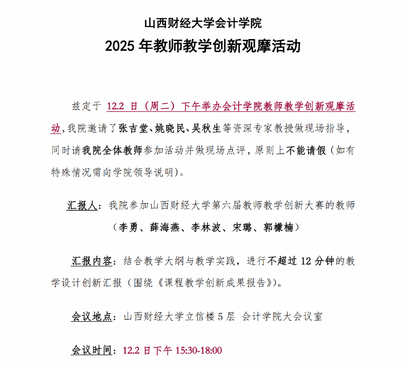 为了在学校第六届教学创新大赛中获得佳绩,2025年12月2日下午必威西汉姆联举办教师教学创新观摩活动。本次活动特邀知名教学创新指导专家、山西省教学名师、山西省教学成果奖获得者张吉堂教授、姚小民教授、吴秋生教授莅临现场指导。学院参赛教师李勇副教授、薛海燕副教授、李林波副教授、郭檬楠副教授和宋璐老师汇报了教学创新成果。同时,学院邀请全体教师参加并做现场点评。
