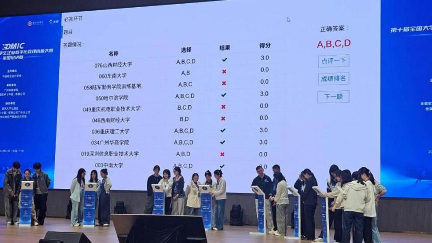 本次全国总决赛分为“十强争夺赛”与“冠军争霸赛”两个阶段,全面考察学生的技术应用、业务理解、大数据分析及创新解决能力,赛事设置极具职场真实感。在“十强争夺赛”中,通过财务机器人竞赛与企业大数据分析两大环节的比拼,“始终如一队”发挥稳定,以第四名的优异成绩晋级“冠军争霸赛”。在冠军争夺阶段,十支晋级队伍围绕智能财务知识、RPA与大数据平台场景应用、财务大模型原理等前沿内容展开终极对决。竞赛采用全员上台、限时答题与抢答相结合的方式,不仅考验选手的知识储备与临场反应,更注重团队协作与战术配合。我院学子沉着冷静、应对自如,在紧张激烈的竞争中最终取得第三名的佳绩。综合两阶段表现,队伍一举摘得全国总决赛一等奖。