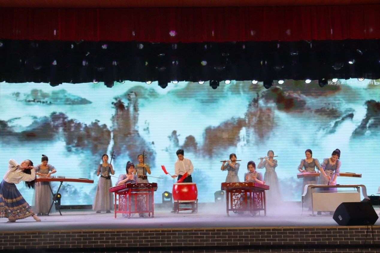 帷幕拉开,粉墨登场。节目《水墨兰亭》将器乐、书法和舞蹈有机结合,弄管调弦,笔走龙蛇,串文化瑰宝,展千年古韵,表达了青年学子继承和弘扬中华优秀传统文化的积极态度,彰显了青年大学生良好的精神风貌。